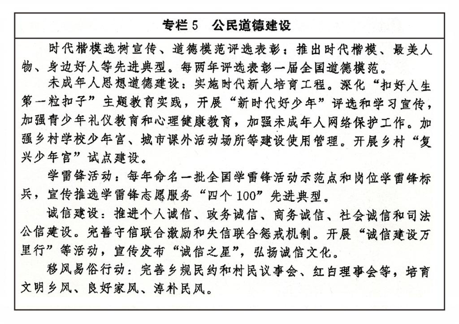 传承弘扬中华传统美德,加强社会公德、职业道德、家庭美德、个人品德建设,加强家庭、家教、家风建设。加强对革命、建设、改革时期各类先进典型的学习宣传,尊崇褒扬英雄模范,关心关爱先进典型人物。健全家庭、学校、政府、社会相结合的思想道德教育体系,把立德树人贯穿学校教育全过程。发挥优秀文化产品陶冶道德情操的作用,完善市民公约、乡规民约、学生守则、团体章程等社会规范,广泛开展弘扬时代新风行动,深化道德领域突出问题治理。加强农村思想道德建设,创新文化科技卫生“三下乡”长效机制。